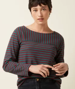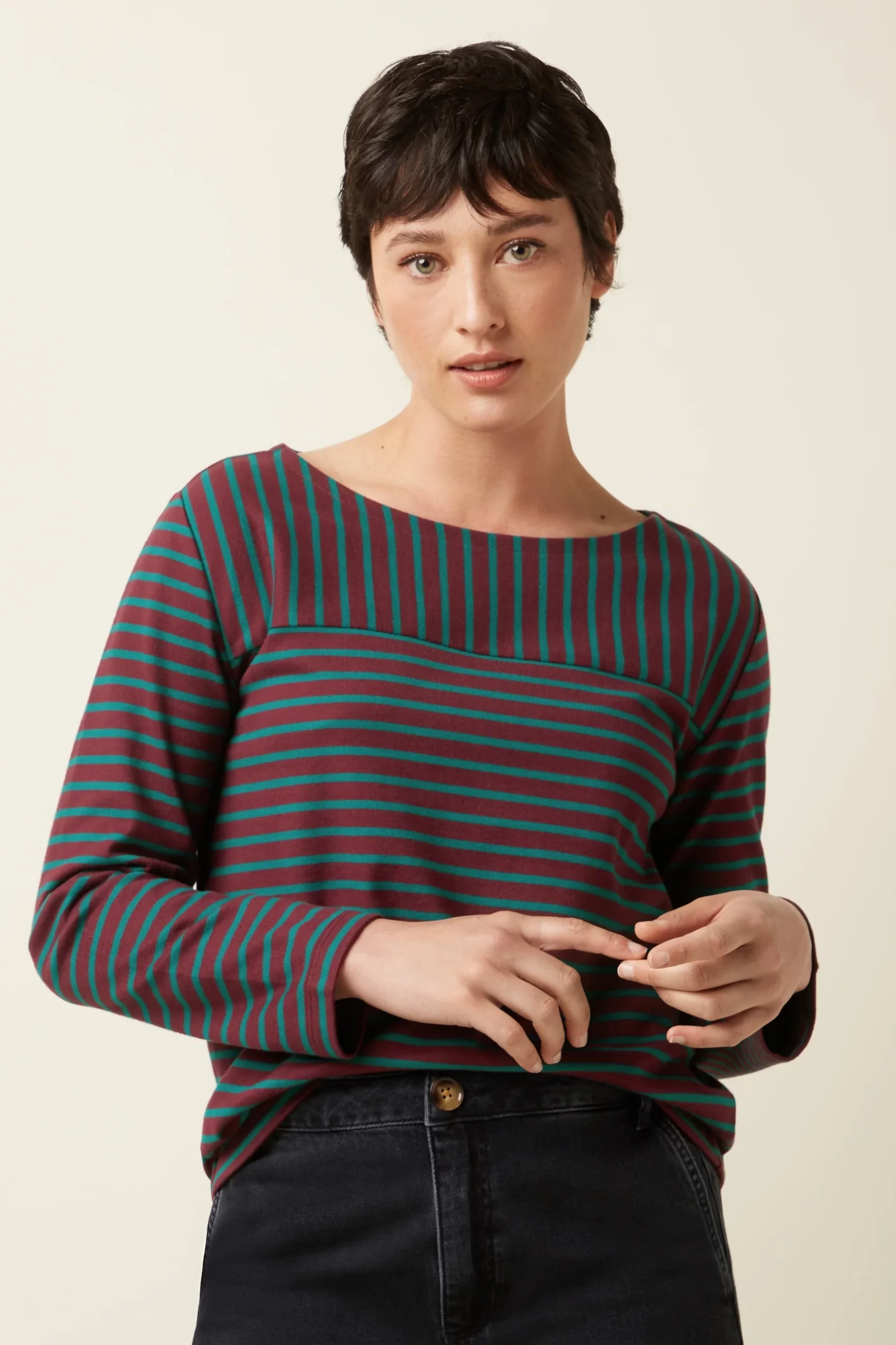 Our Boatneck Top showcases a nautical vibe with jersey stripes and is available in two color combinations.