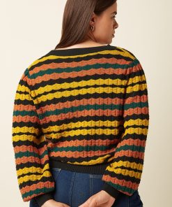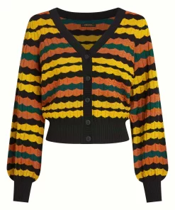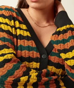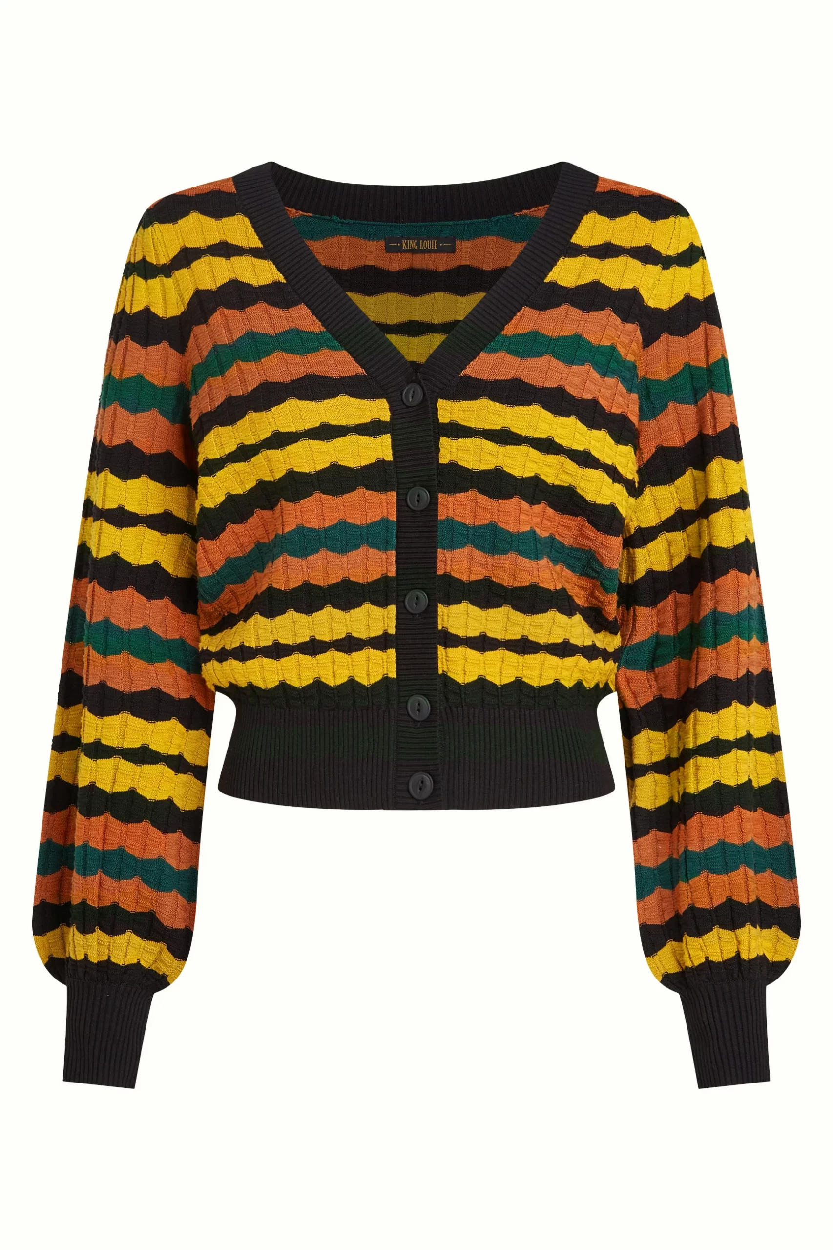 This colorful cardigan is made from stretchy cotton knit with ribbed edges, long sleeves, a V-neck, and buttons for easy wear.