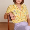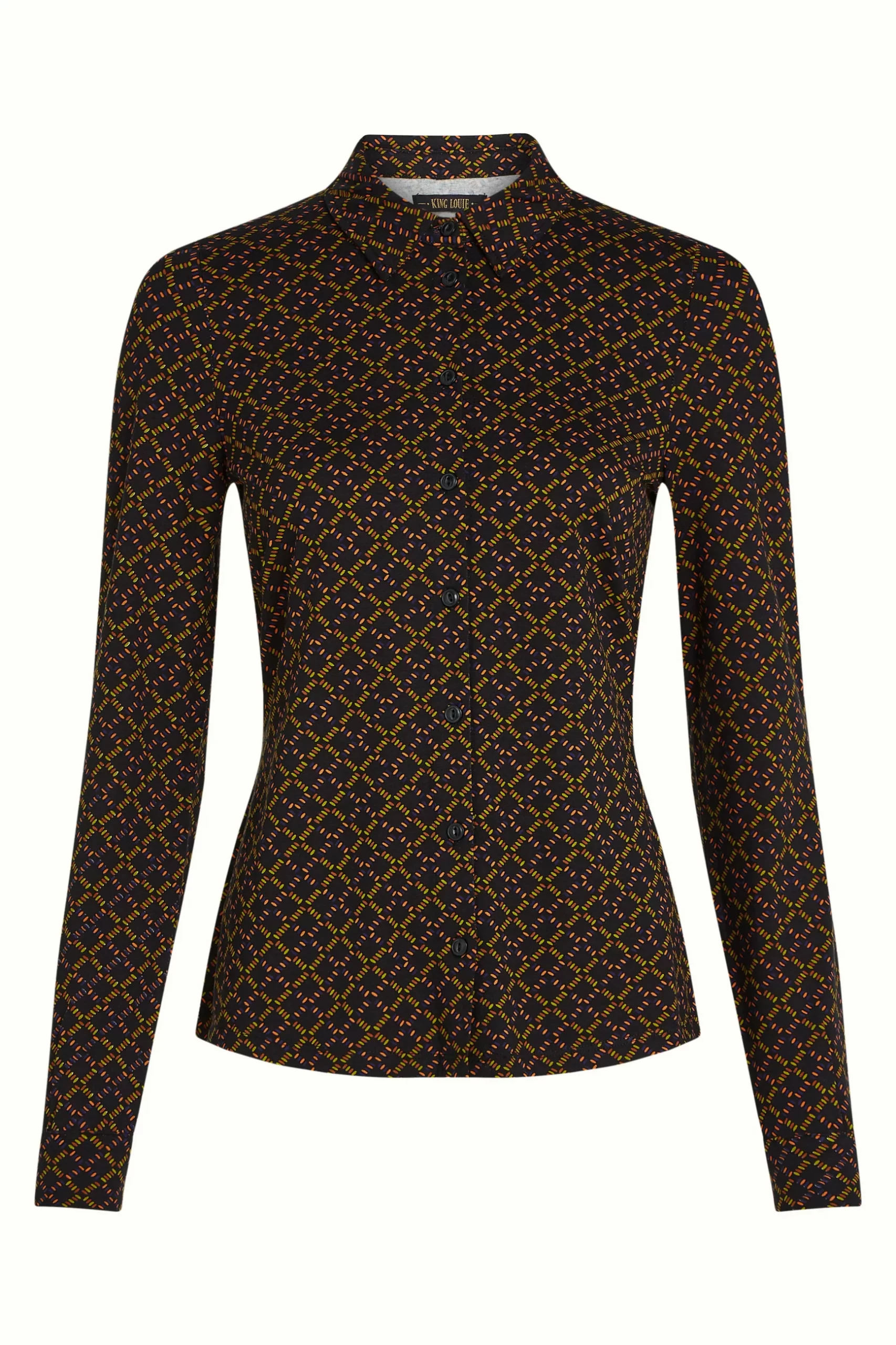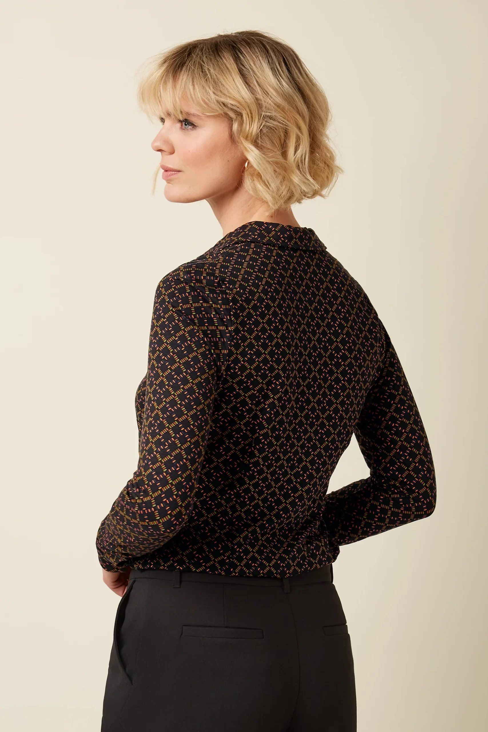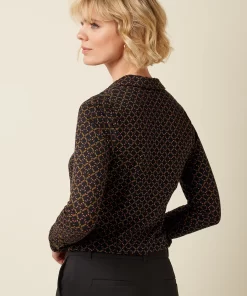 This blouse features a stretchy viscose jersey fabric with a graphic print, long sleeves finished with cuffs, a classic collar, and a button-down front for easy wear.