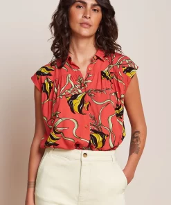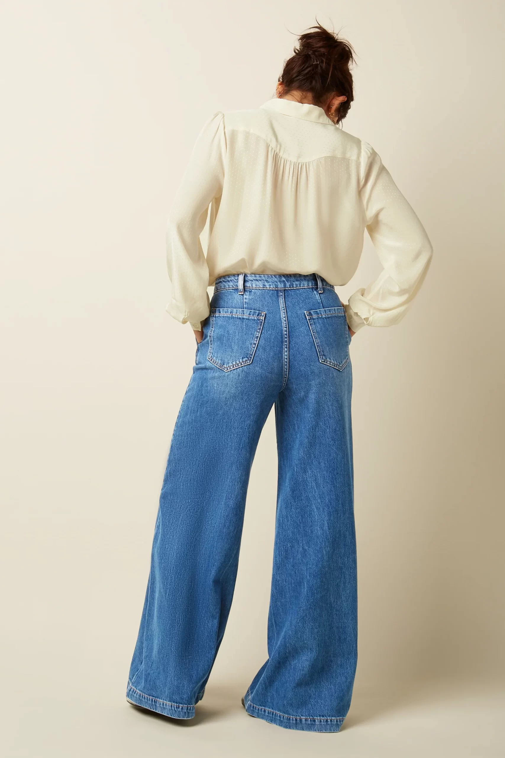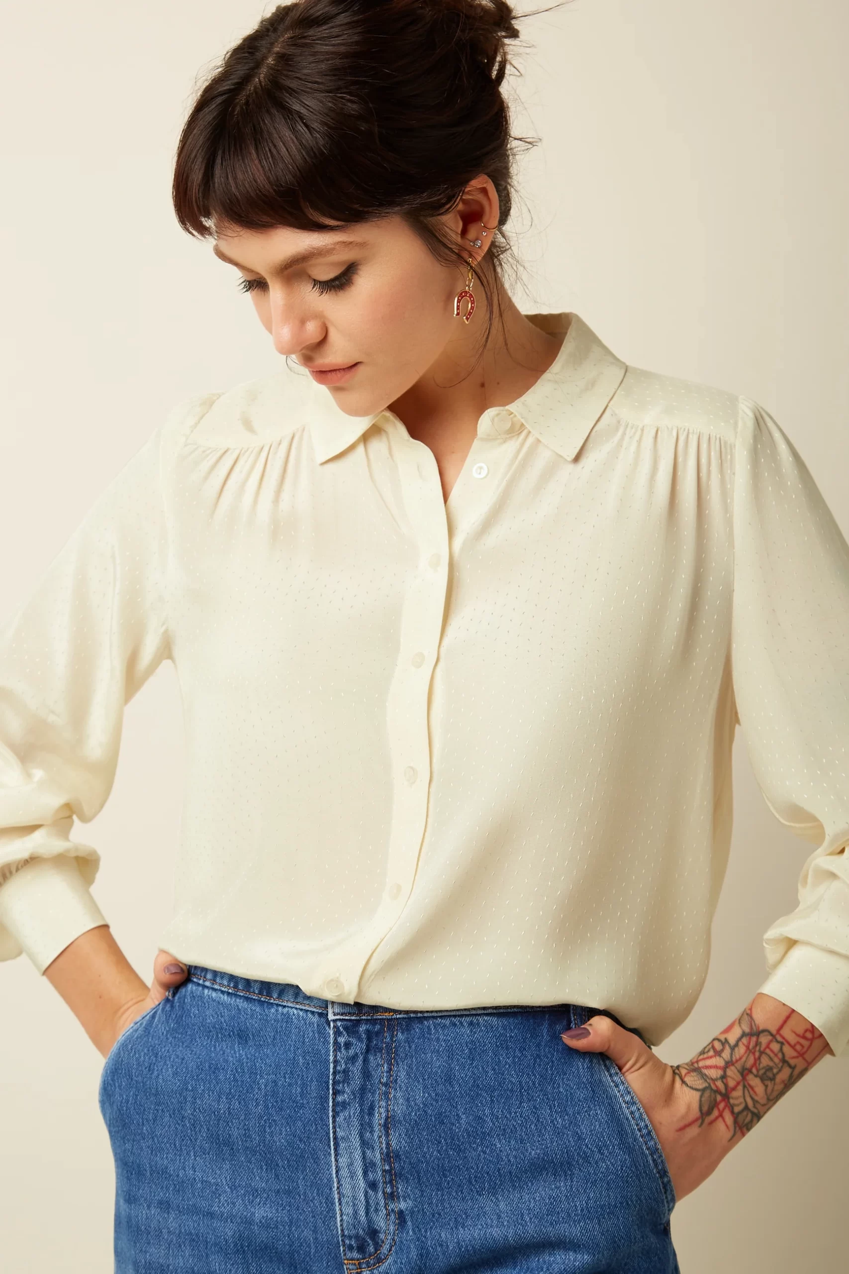The Carina Blouse Sista combines a classic collar and button closure with long sleeves featuring cuffs and delicate pleats from the shoulder yoke and sleeves. Made from soft woven viscose, it offers a refined, elegant look with comfortable wear.