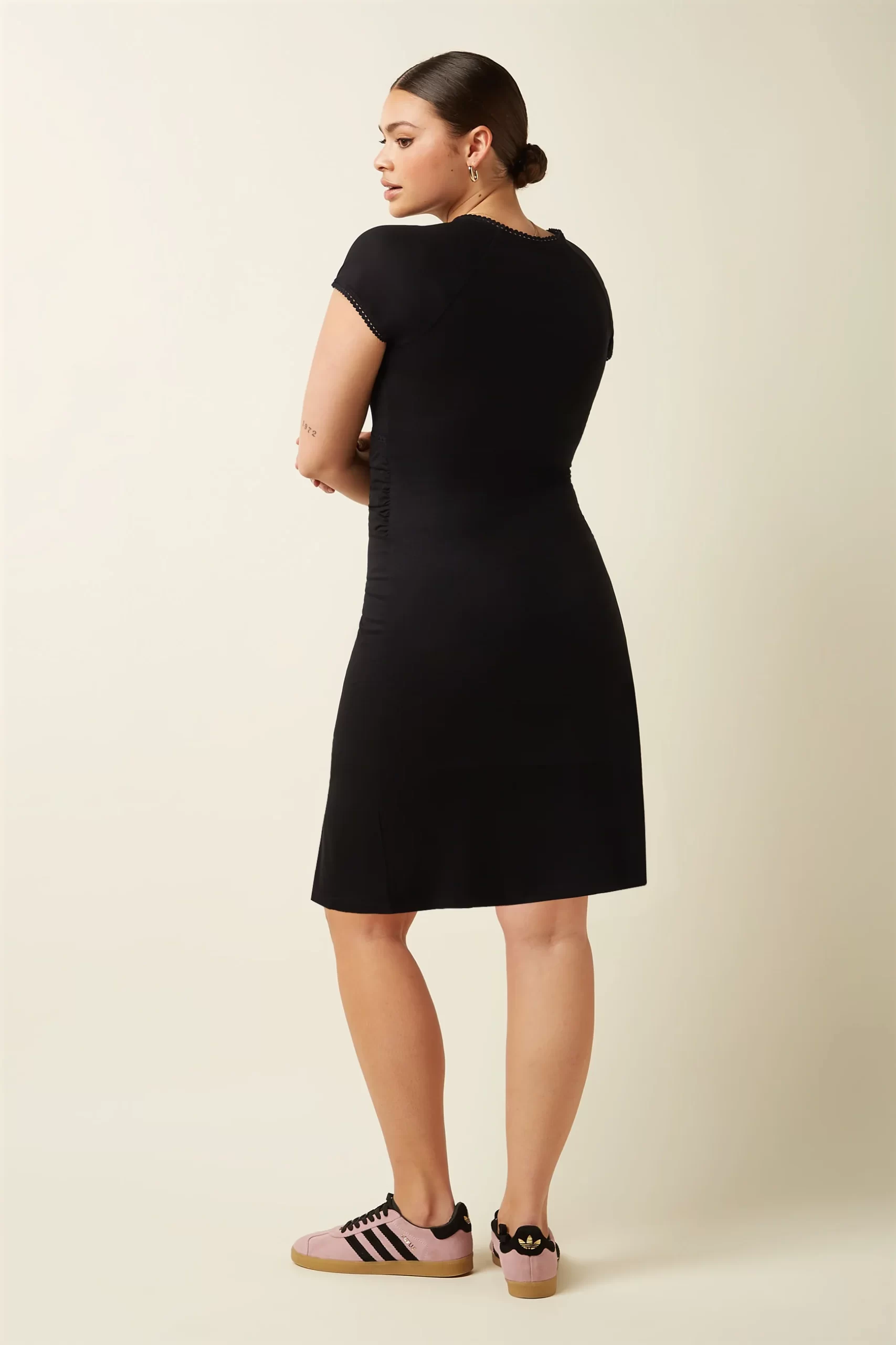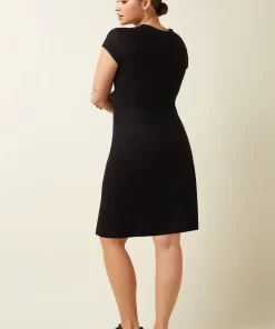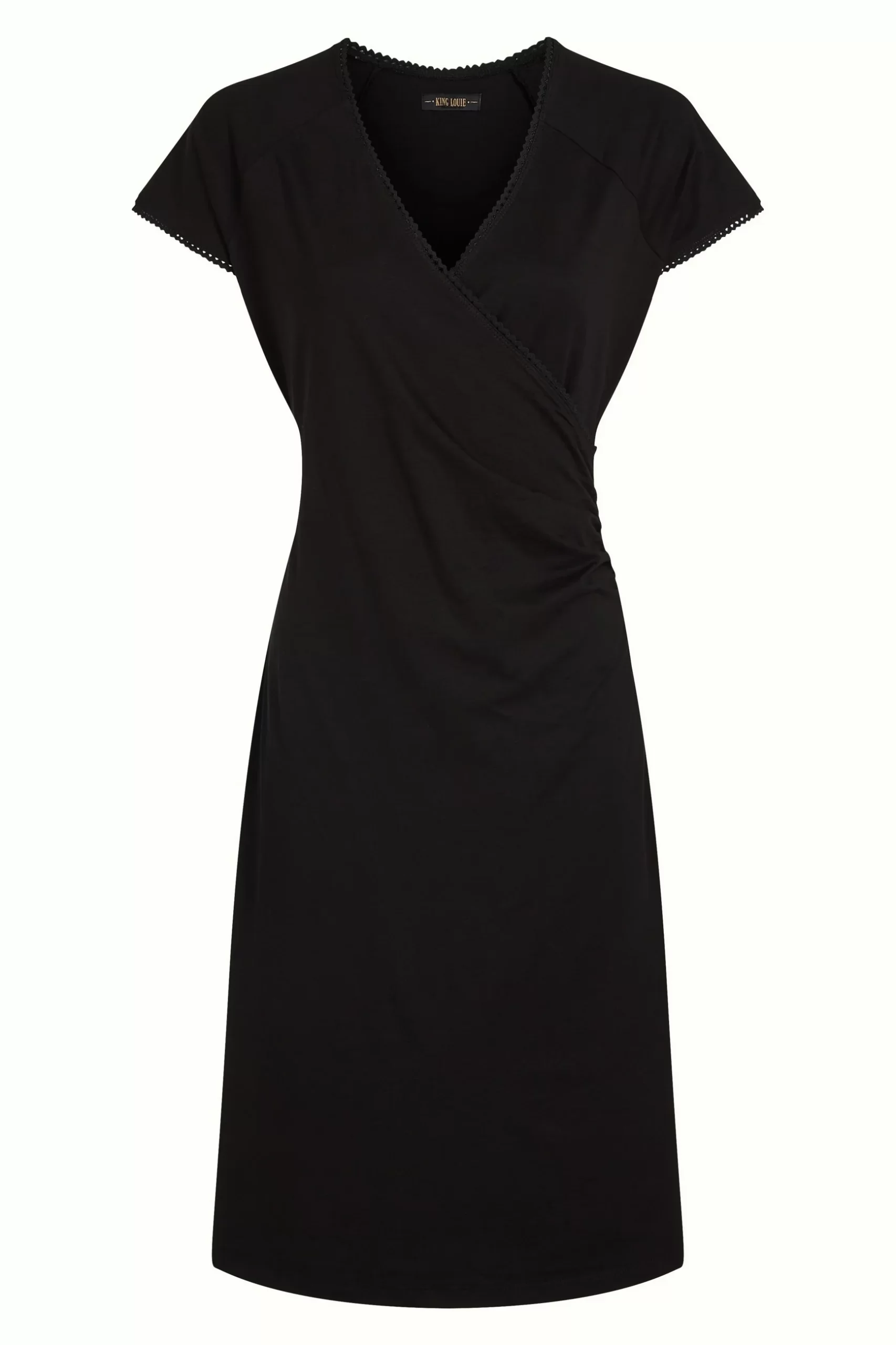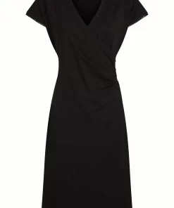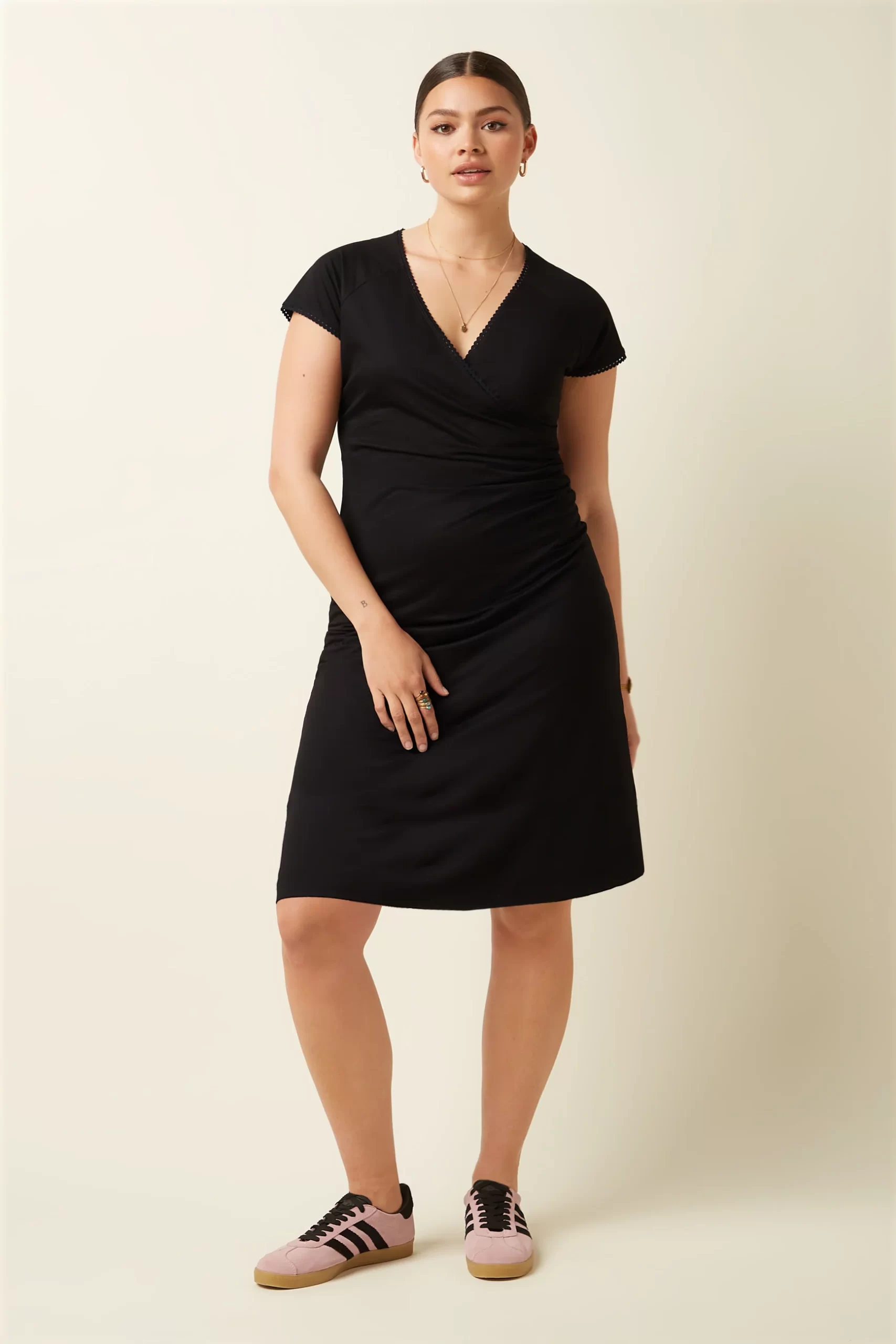 This elegant wrap dress features a flattering V-neck and delicate ric rac trim, enhancing its refined silhouette. Designed with raglan sleeves and a slightly flared, knee-length cut, it offers a comfortable regular fit. Crafted from stretch viscose, it ensures both softness and ease of movement, making it a sophisticated choice for any occasion.
