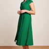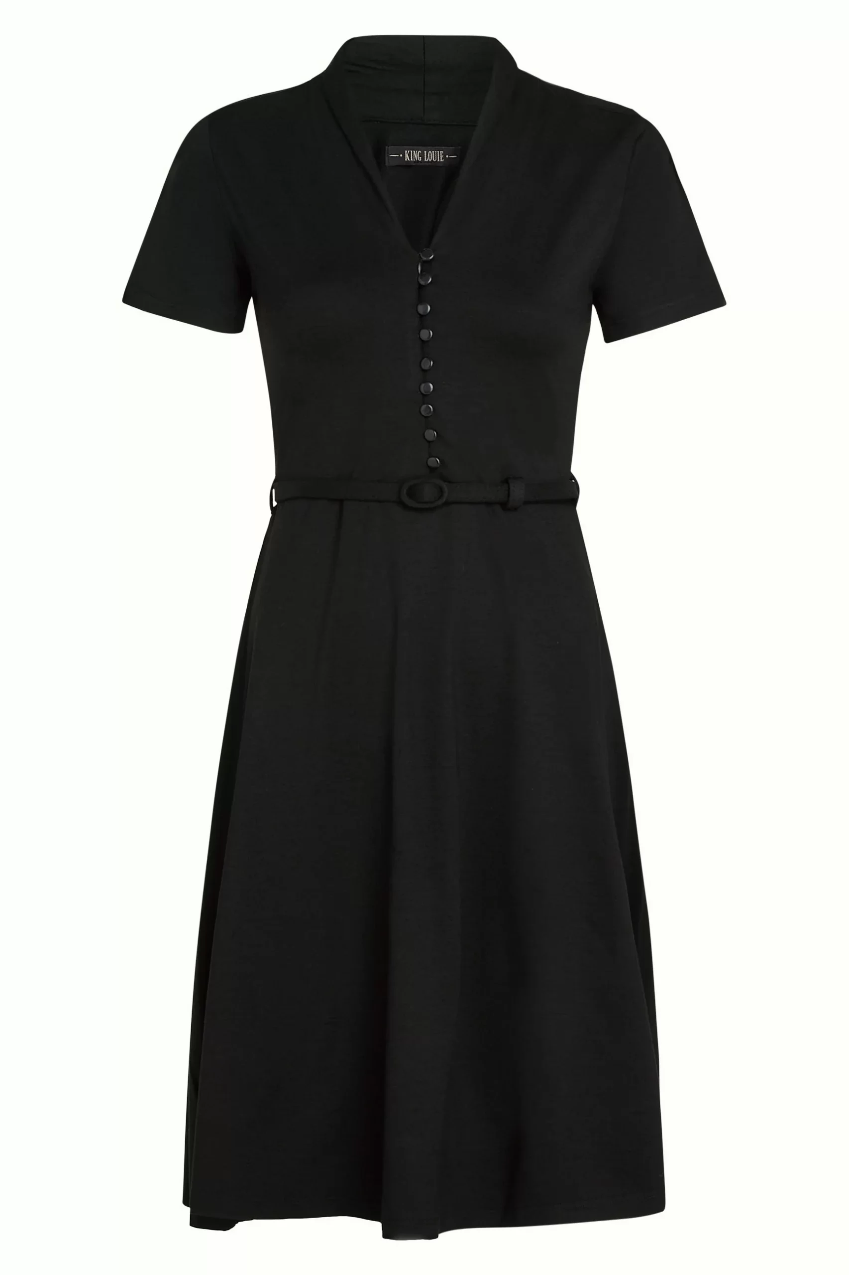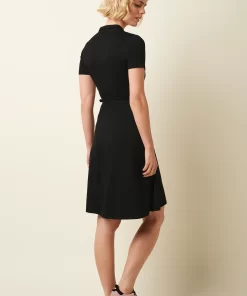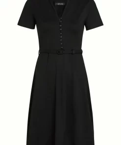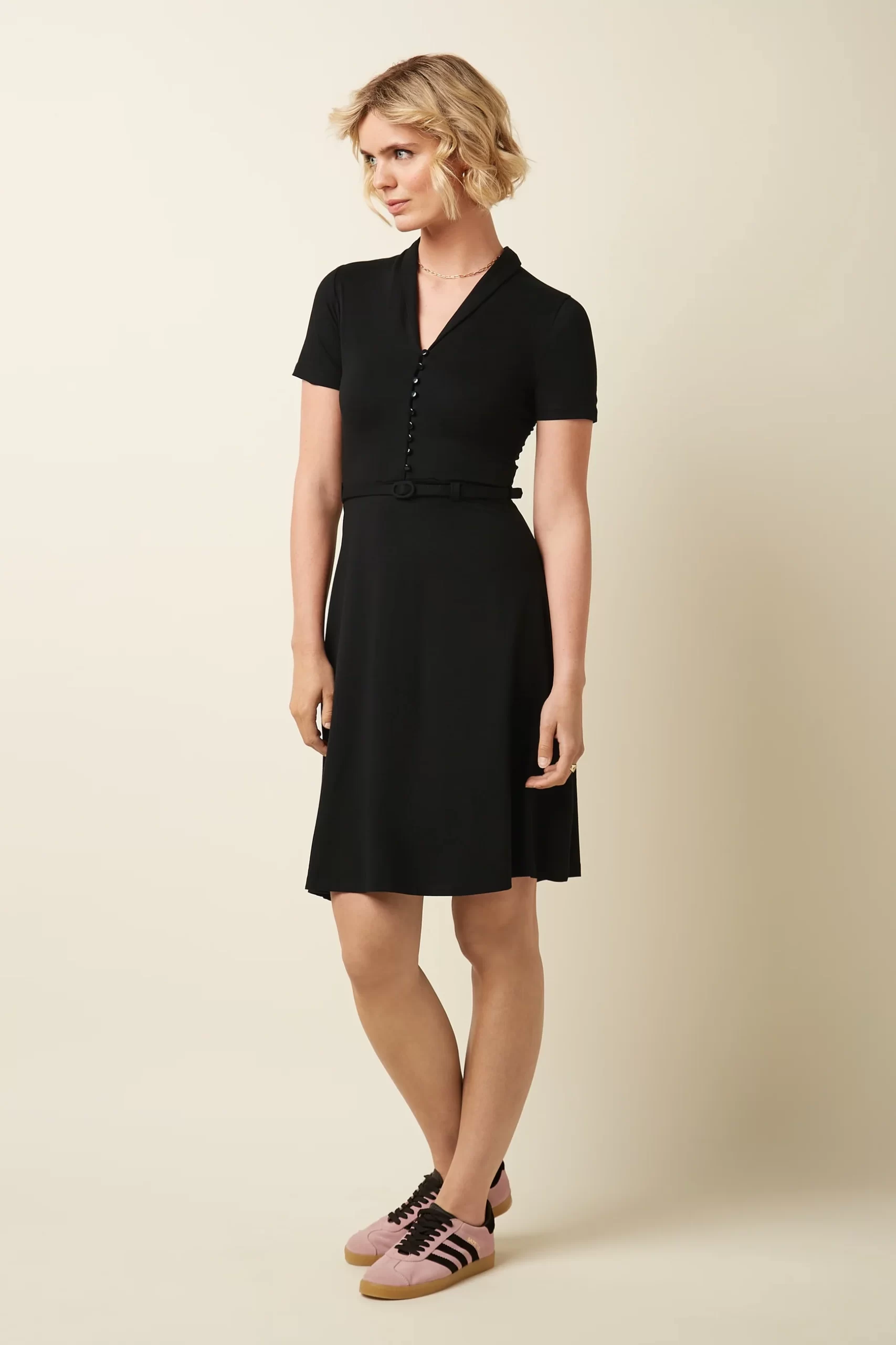 Elevate your wardrobe with the Emmy Dress Viscose Classic. Its elegant shawl collar and short sleeves create a timeless look, while the stretch viscose fabric ensures all-day comfort. The knee-length, flared silhouette, enhanced by a tie belt and button closure, flatters every figure. Perfect for making a confident statement at any event, this dress combines style and ease effortlessly.