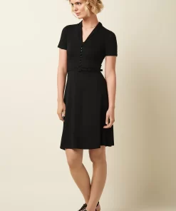 Elevate your wardrobe with the Emmy Dress Viscose Classic. Its elegant shawl collar and short sleeves create a timeless look, while the stretch viscose fabric ensures all-day comfort. The knee-length, flared silhouette, enhanced by a tie belt and button closure, flatters every figure. Perfect for making a confident statement at any event, this dress combines style and ease effortlessly.