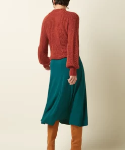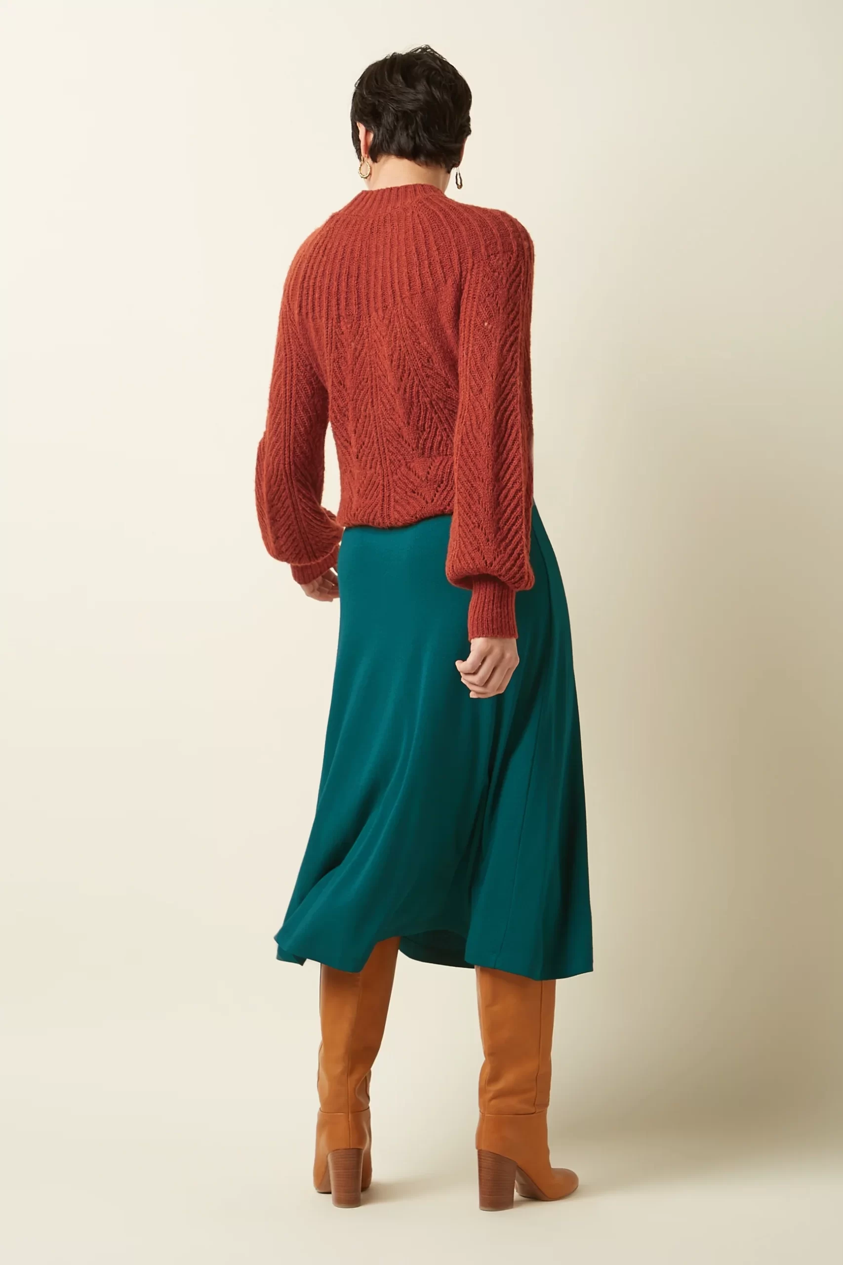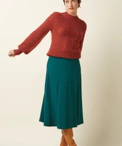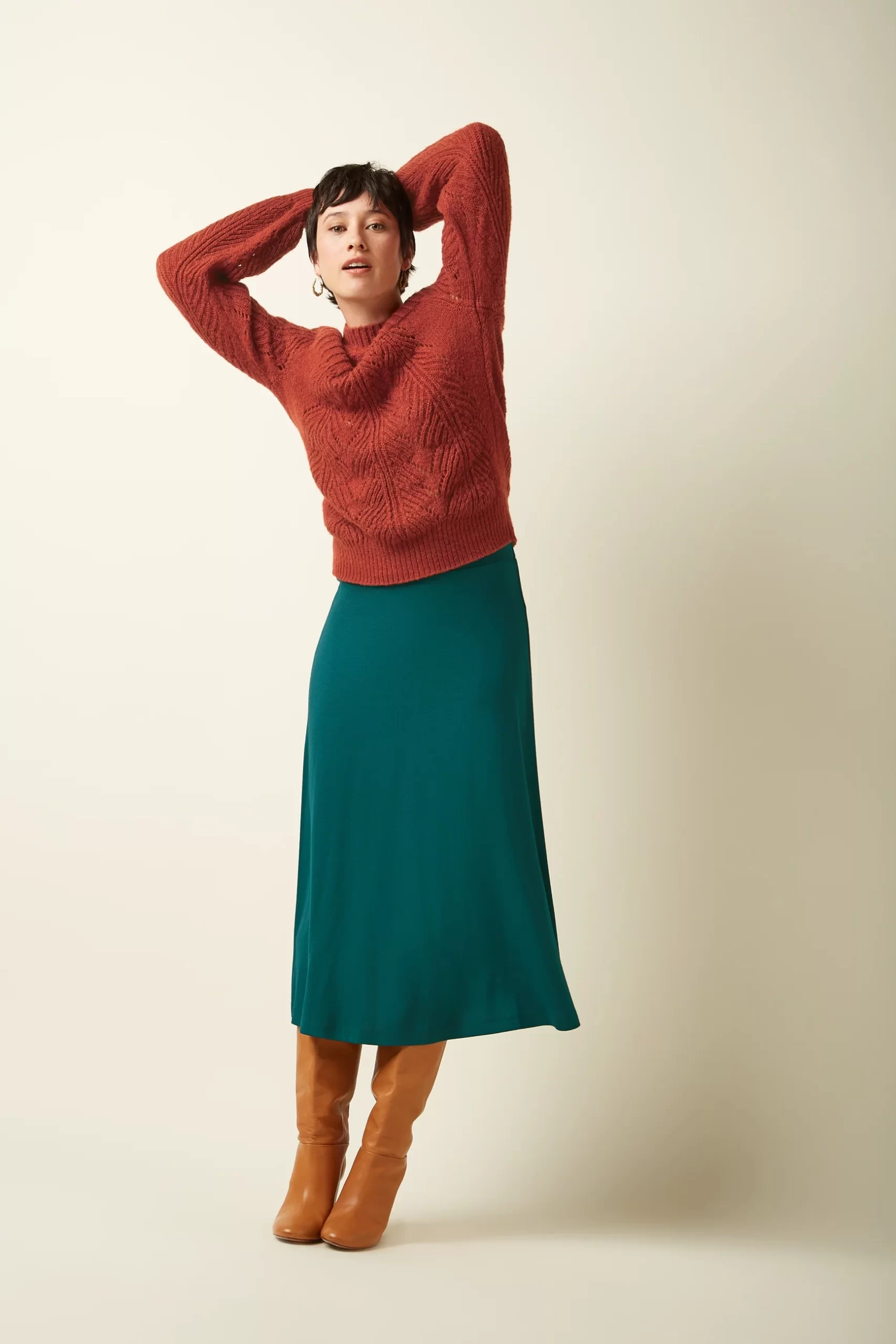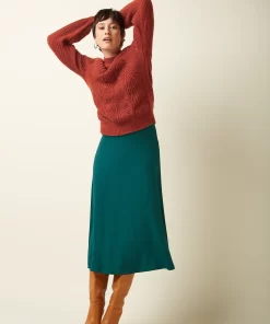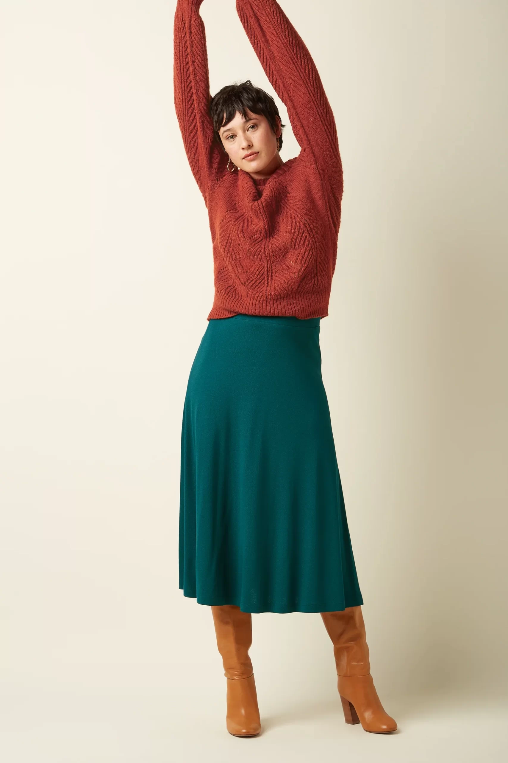 The Juno Midi Skirt Milano Crepe features a sophisticated flared silhouette and midi length, crafted from stretch viscose for a smooth, comfortable fit. Its high waist with a thin elastic waistband offers subtle shaping, creating an elegant and timeless look.