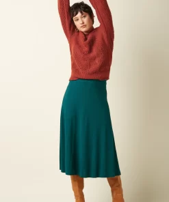 The Juno Midi Skirt Milano Crepe features a sophisticated flared silhouette and midi length, crafted from stretch viscose for a smooth, comfortable fit. Its high waist with a thin elastic waistband offers subtle shaping, creating an elegant and timeless look.