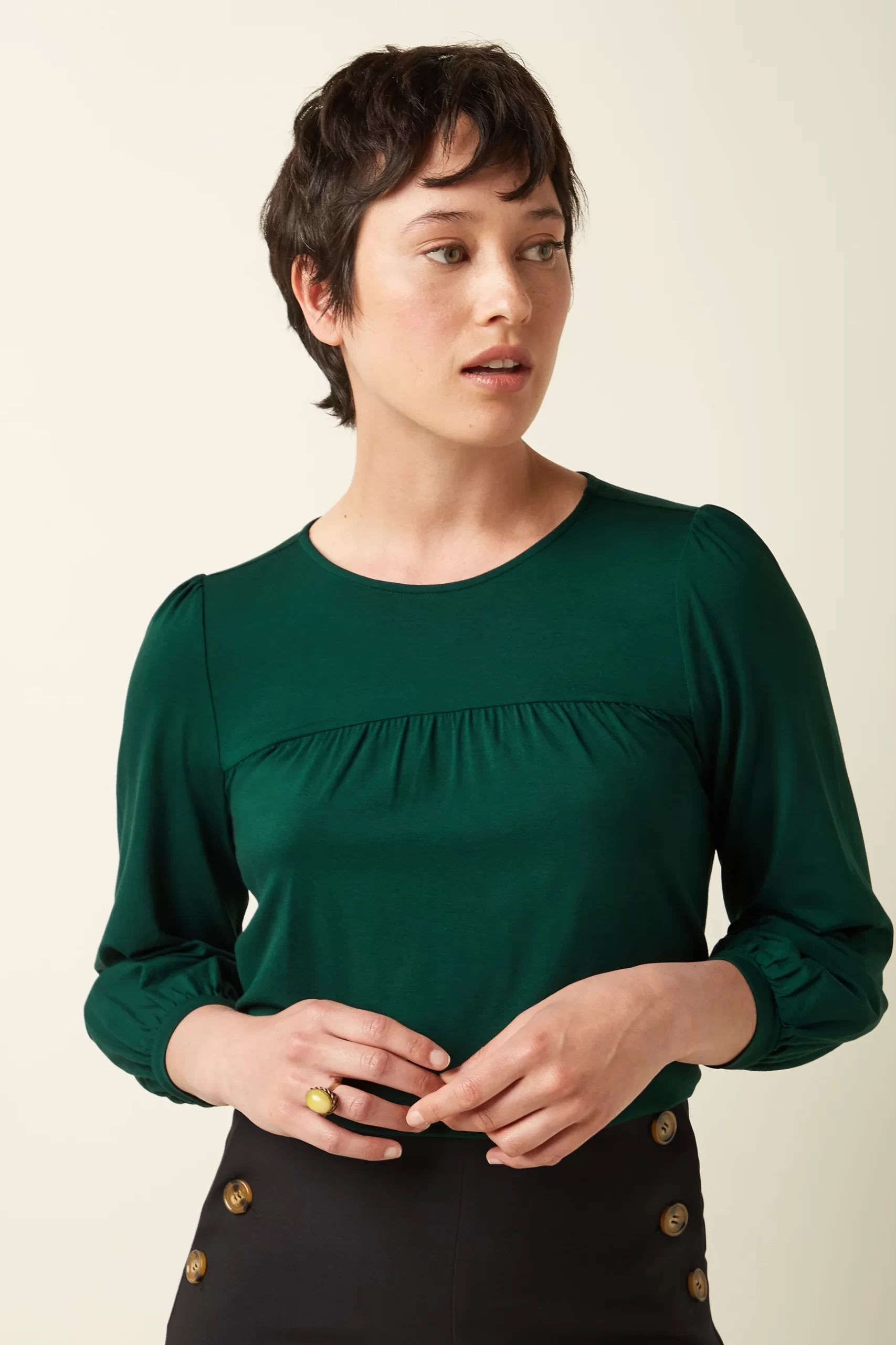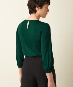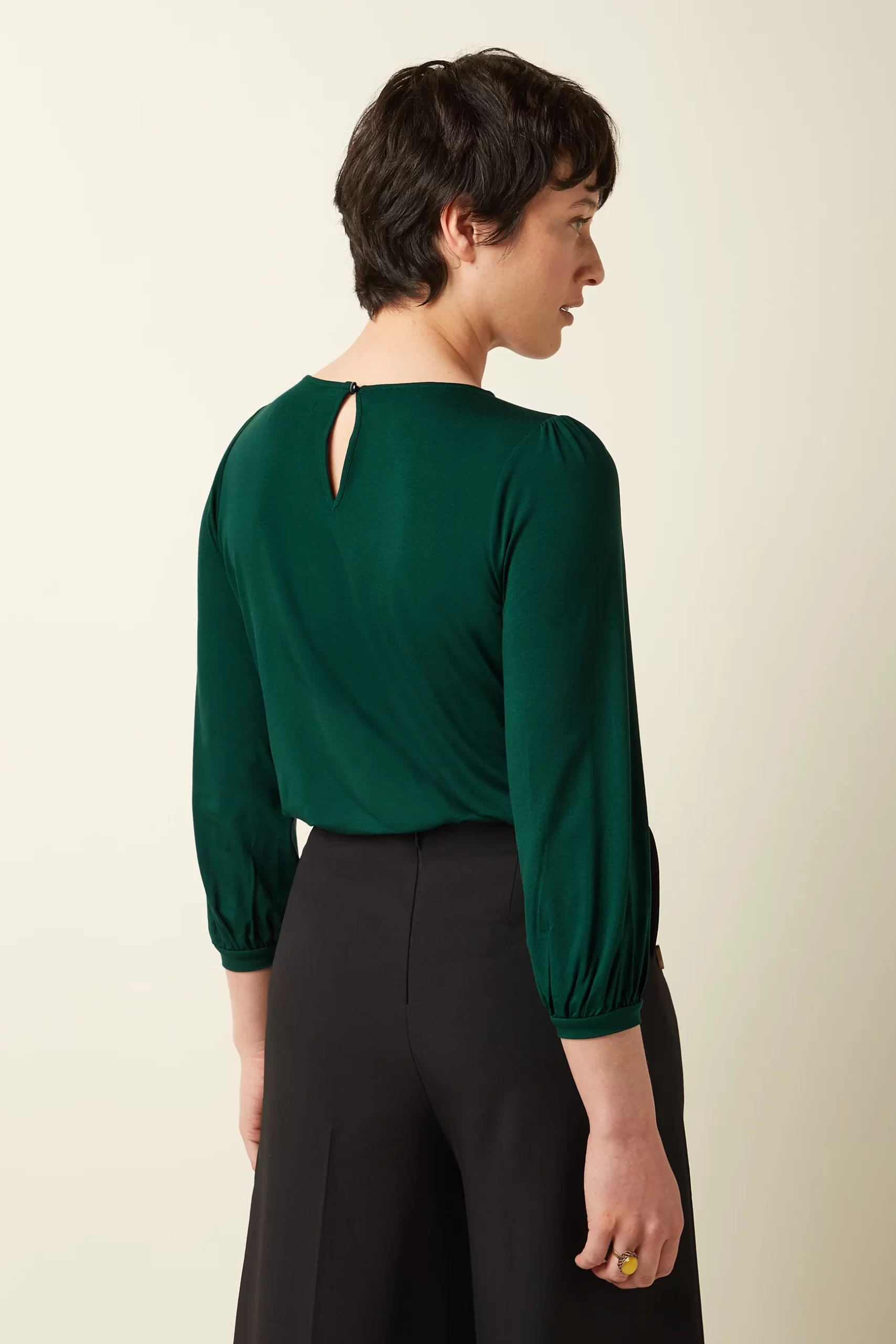 The Luella Top Viscose Light offers delicate yoke pleats, 3/4 cuffed sleeves, and a round neckline with keyhole button, crafted from stretchy viscose jersey for comfort and style.