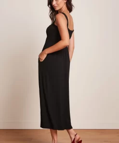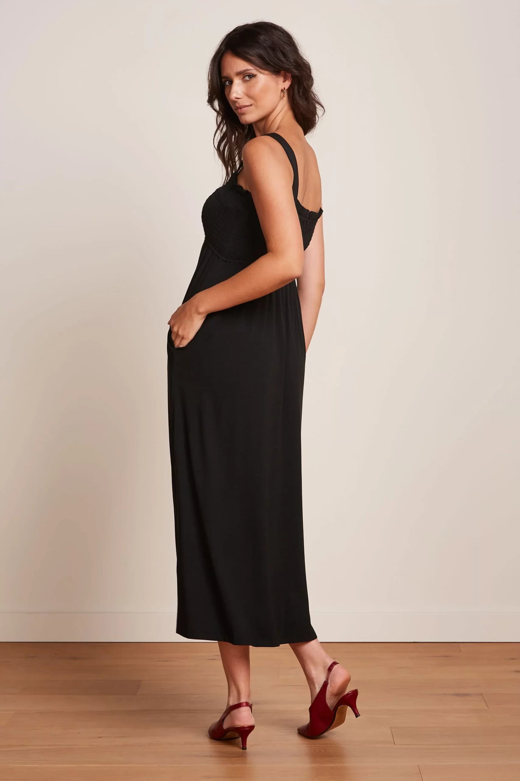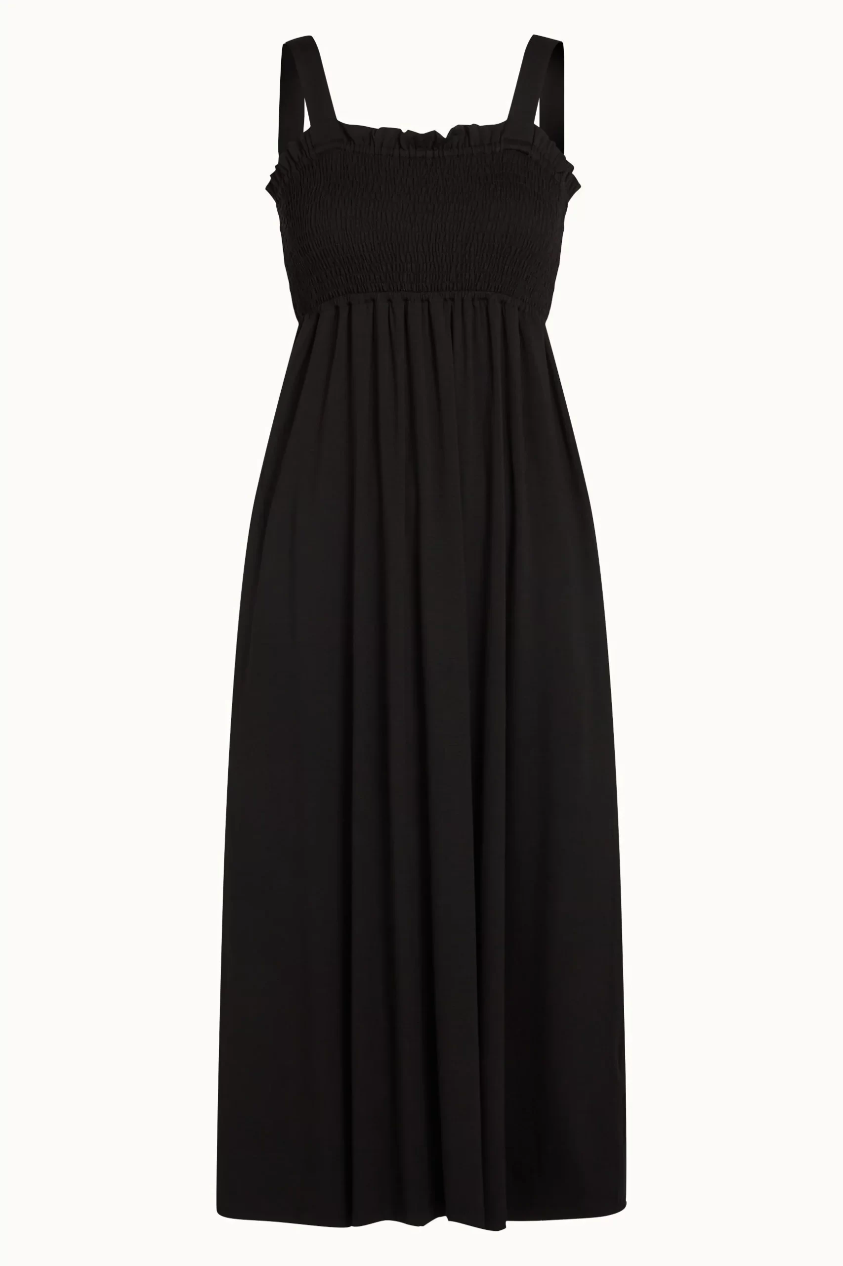 Long jersey dress with a unique smock-elastic top that adds a touch of flirty and femininity. The straight line silhouette creates a modern look, perfect for different occasions.
