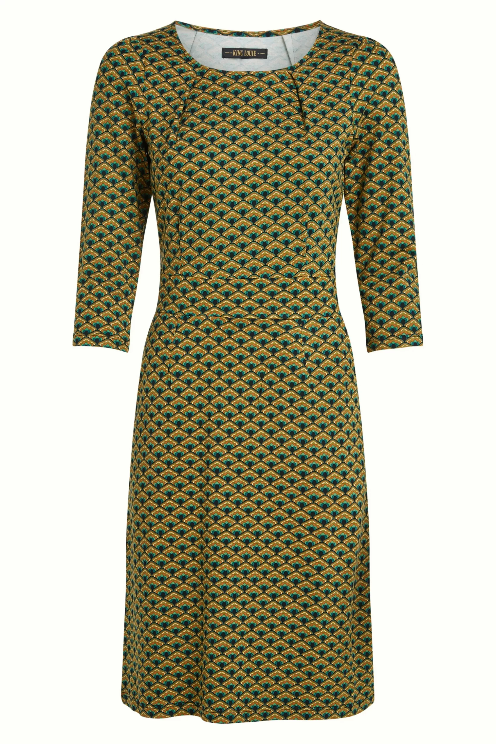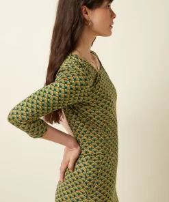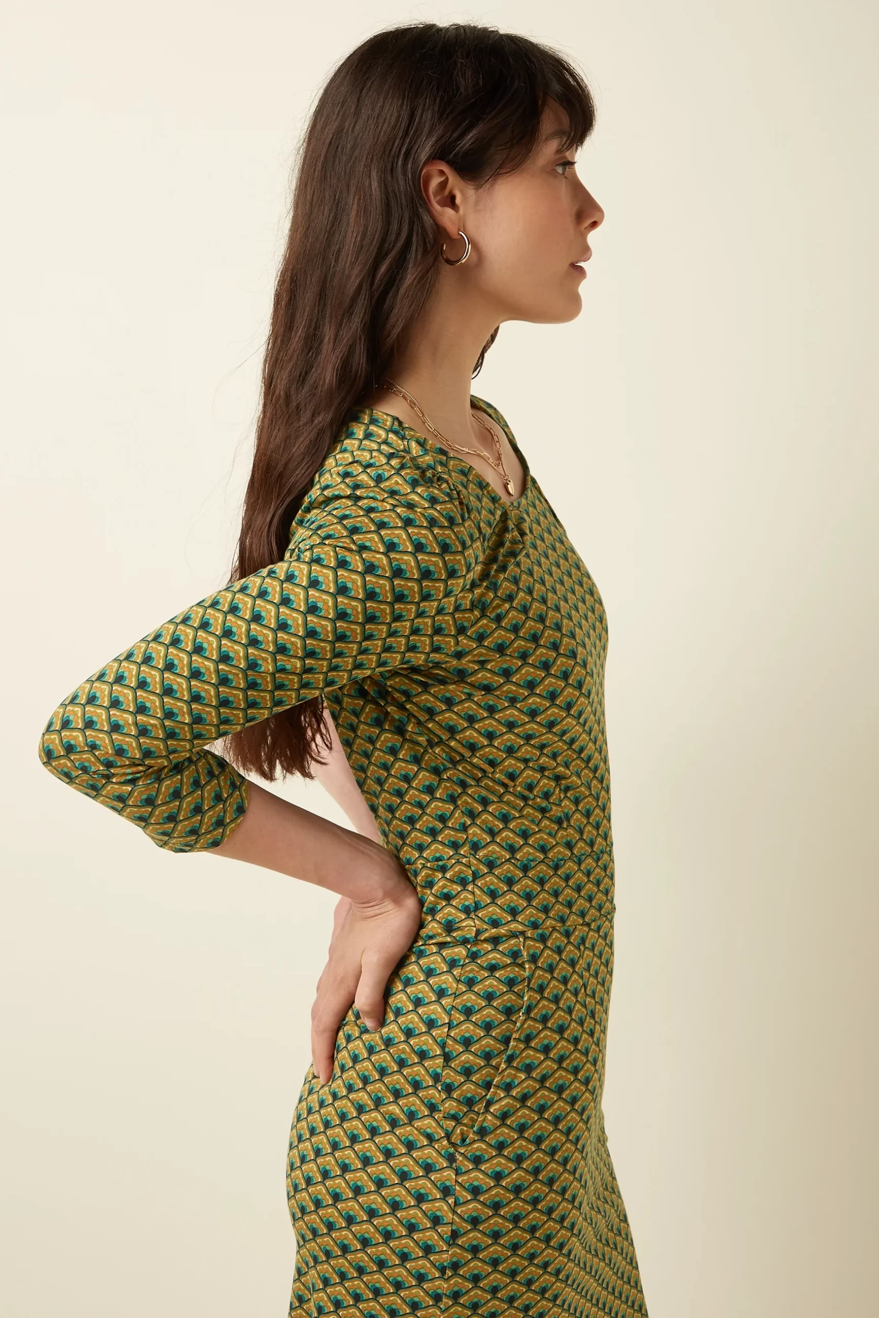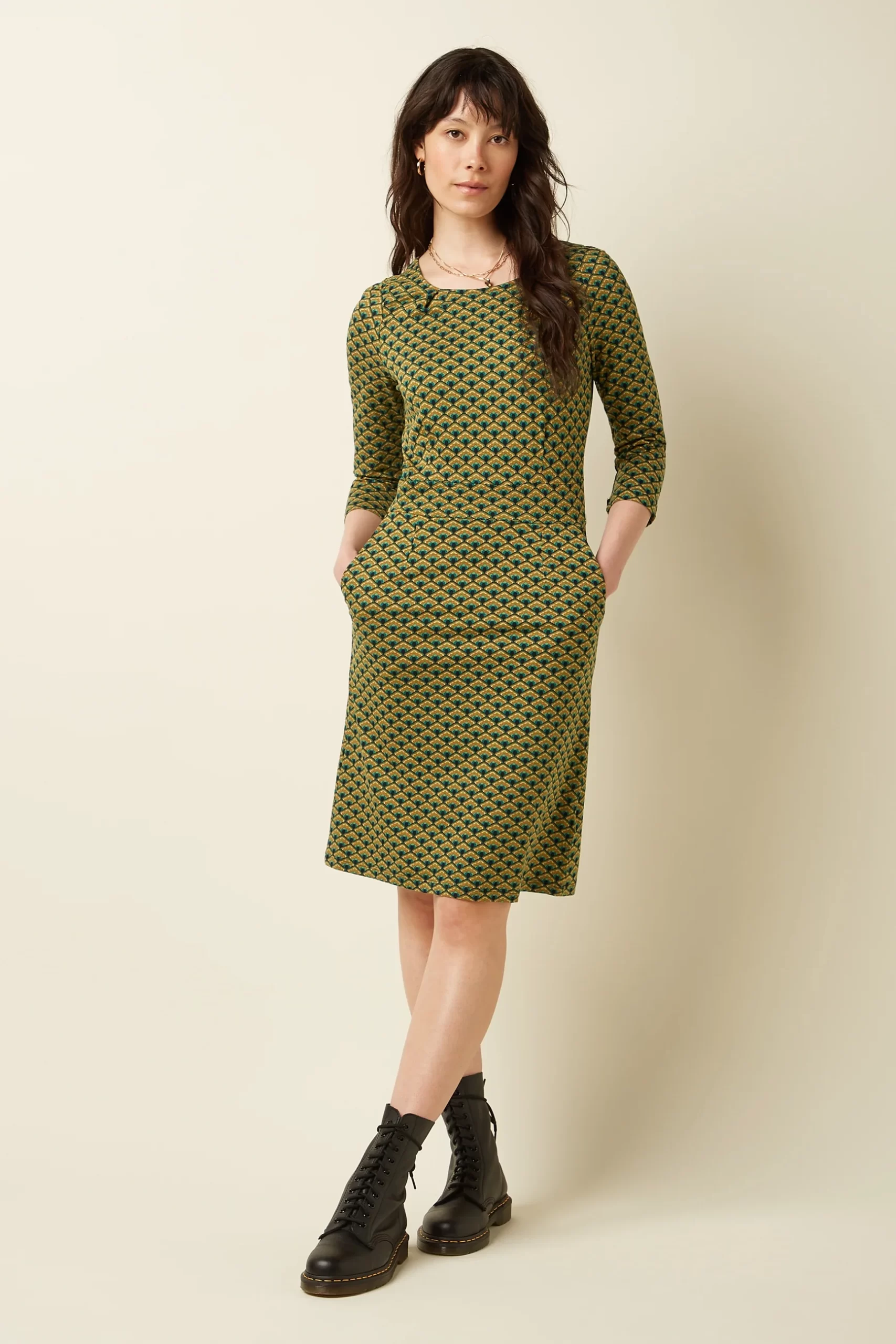 The Mona Dress Frio combines a fitted silhouette with a round pleated neckline, stretch viscose jersey, and a fixed waistband. Featuring 3/4 sleeves, side pockets, and a graphic print, it offers elegant style in a knee-length design.