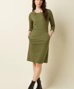 The Mona Dress Frio combines a fitted silhouette with a round pleated neckline, stretch viscose jersey, and a fixed waistband. Featuring 3/4 sleeves, side pockets, and a graphic print, it offers elegant style in a knee-length design.